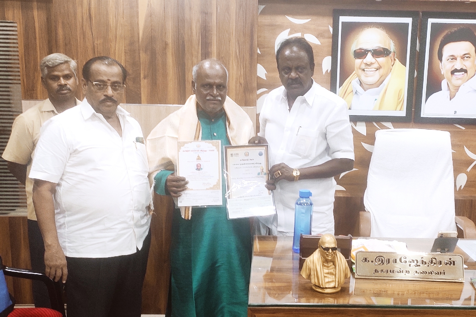 பள்ளித்தோழர் இரா. சைரன் திருவள்ளுவர் பள்ளி தாளாளர் அவர்களிடம் முதல்வரின் கிரீன் சேம்ப்பியன், தமிழ்ச்செம்மல் விருதுகளைக் காண்பித்து வாழ்த்து பெறப்பட்டது